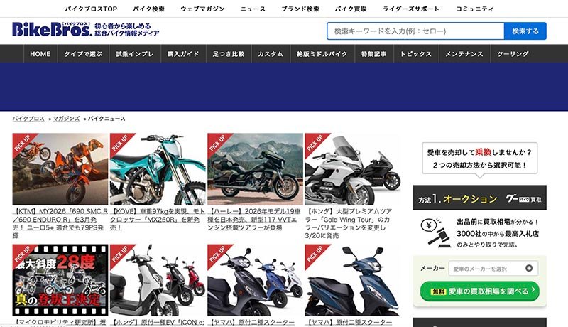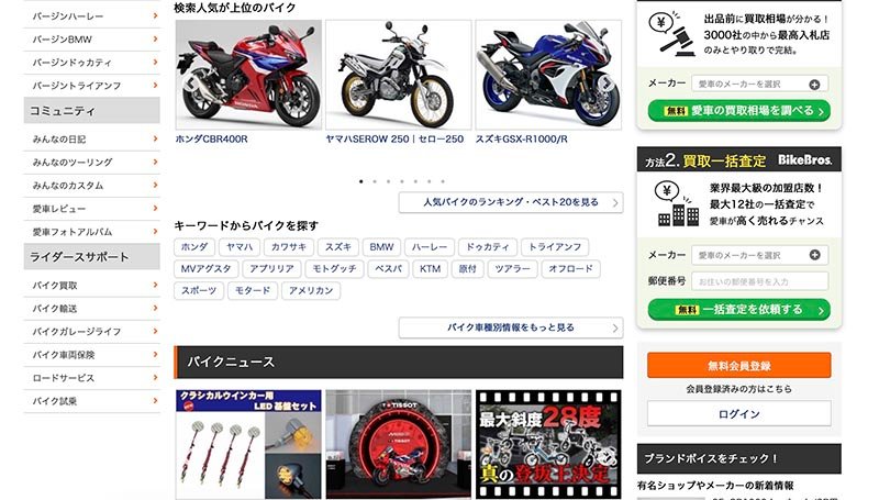 BikeBros is a Japanese motorcycle marketplace offering parts, riding gear, and used motorcycles with model-based search for domestic and imported bikes.